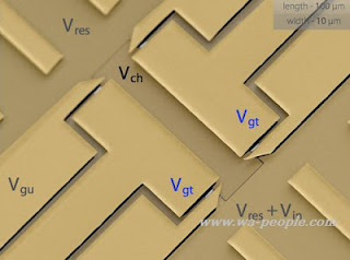 圖說:Dr. David Rees在RIKEN製作的微米尺寸點接觸元件的電子顯微鏡影像。點接觸元件浸放在液態氦中,並在液氦表面灌注電子使其經由中央通道傳輸,電流大小由Vgt電壓和Vch電壓控制。