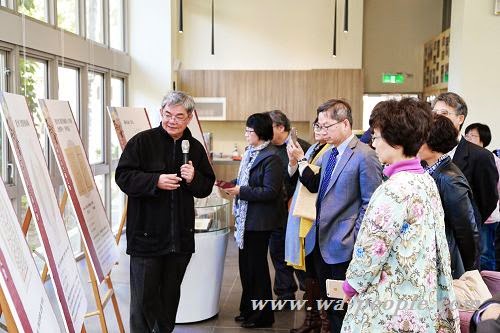 圖說:「文化薈—清華名人手稿文物暨特藏文物發展基金捐贈儀式」會後,國立清華大學中文系楊儒賓教授(左一)為來賓逐一導覽解說清華名人文物。