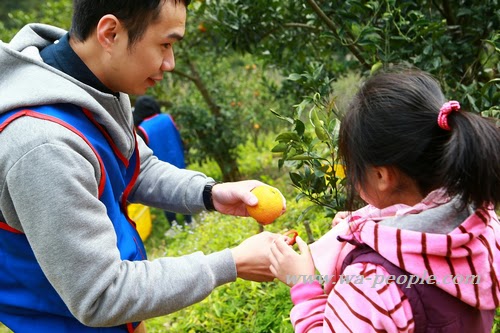 圖說:工研院志工與弱勢學童,大小牽小手,一同前往芎林鄉的柑橘園採橘。
