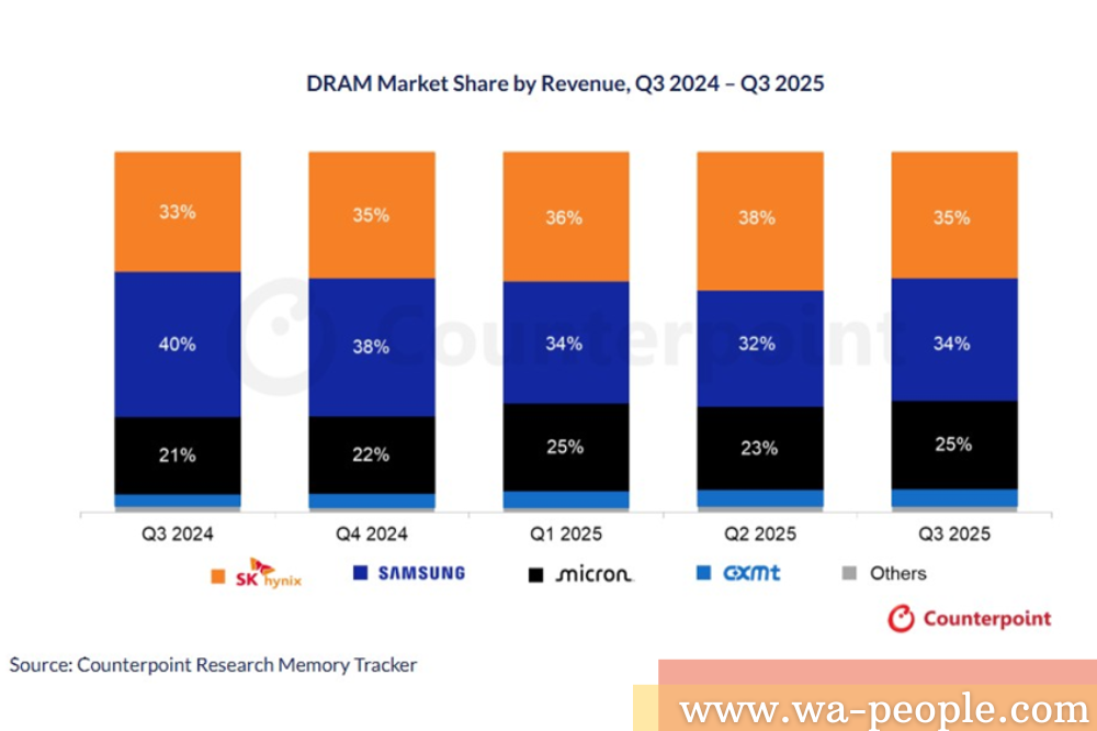 根據Counterpoint Research《Memory Tracker》最新報告顯示,SK hynix 於2025年第三季DRAM營收達137億美元,季增11%、年增54%,以35%的營收市佔率連續三季維持全球DRAM市場首位,並創下單季歷史新高。 本季營收成長主要受到HBM(高頻寬記憶體)與通用型DRAM需求上升的帶動。
