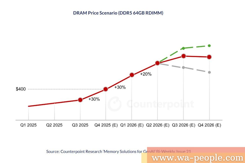 傳統上,伺服器依賴具備 ECC(錯誤校正)的DDR記憶體以確保可靠性;但 NVIDIA 為降低功耗,正改採 LPDDR,並將錯誤校正在 CPU 端處理,而非依賴 DDR5 ECC。在高度受限的供應情境下,Counterpoint 預測DDR5 64GB RDIMM 模組價格將自 2025 年第一季至 2026 年底期間倍增。