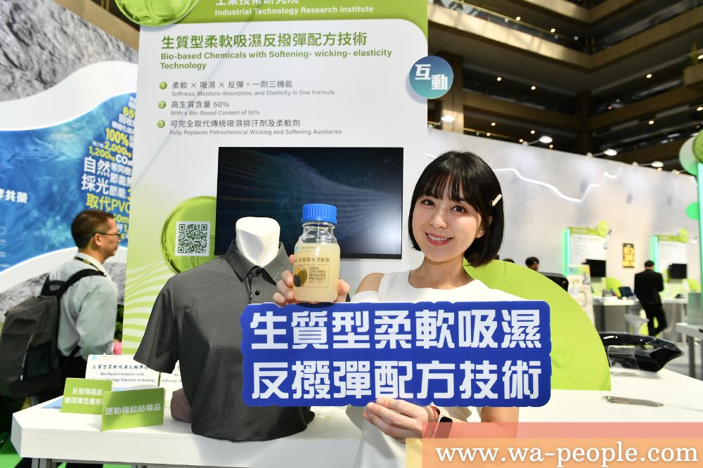 環保永續風潮蔚為趨勢,傳統柔軟劑僅有單一功能、來源非永續,若欲同時賦予柔軟、吸濕、反撥彈性機能,製程複雜且劑量控制困難,提高碳排與成本。在產業技術司補助下,工研院「生質型柔軟吸濕反撥彈配方技術」,以衣康酸(Itaconic Acid)開發兼具柔軟、吸濕與反撥彈三合一生質機能助劑,減少反覆測試與成本,碳排較傳統材料低40%,年減碳3.2萬噸,吸濕速度較市售快2.5 倍,摩擦係數、柔軟度與懸垂指標更優於競品,已與儒鴻、佳和實業合作,進軍國際瑜珈服飾品牌。