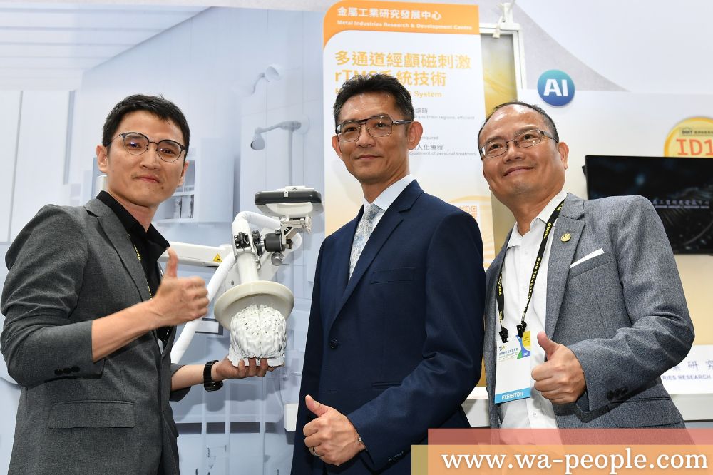 圖說:金屬中心「多通道經顱磁刺激rTMS系統技術」,左起為金屬中心工程師胡博期、經濟部產業技術司司長郭肇中、金屬中心執行長賴永祥。