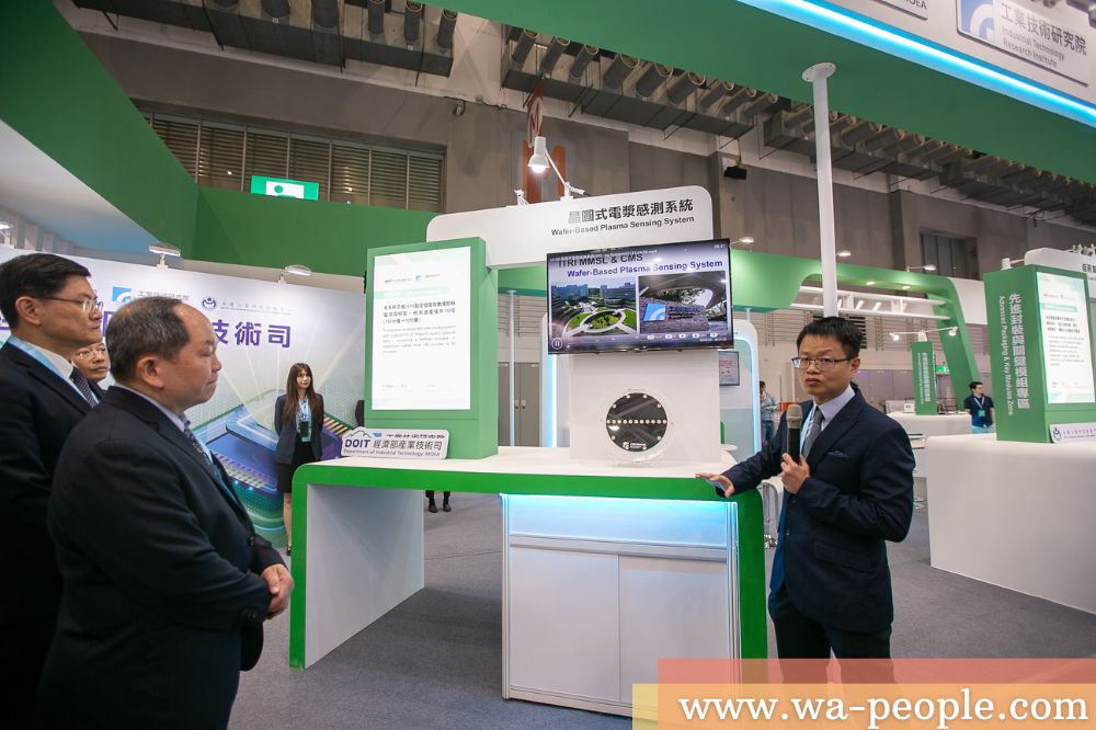 圖說:經濟部產業技術司副司長周崇斌(左)聆聽工研院機械所黃萌祺博士介紹「晶圓式電漿感測系統」,可在不中斷產線下即時監測電漿均勻度,即時回傳數據,將智慧感測器加入半導體產線,大幅提升製程穩定性及晶片良率。