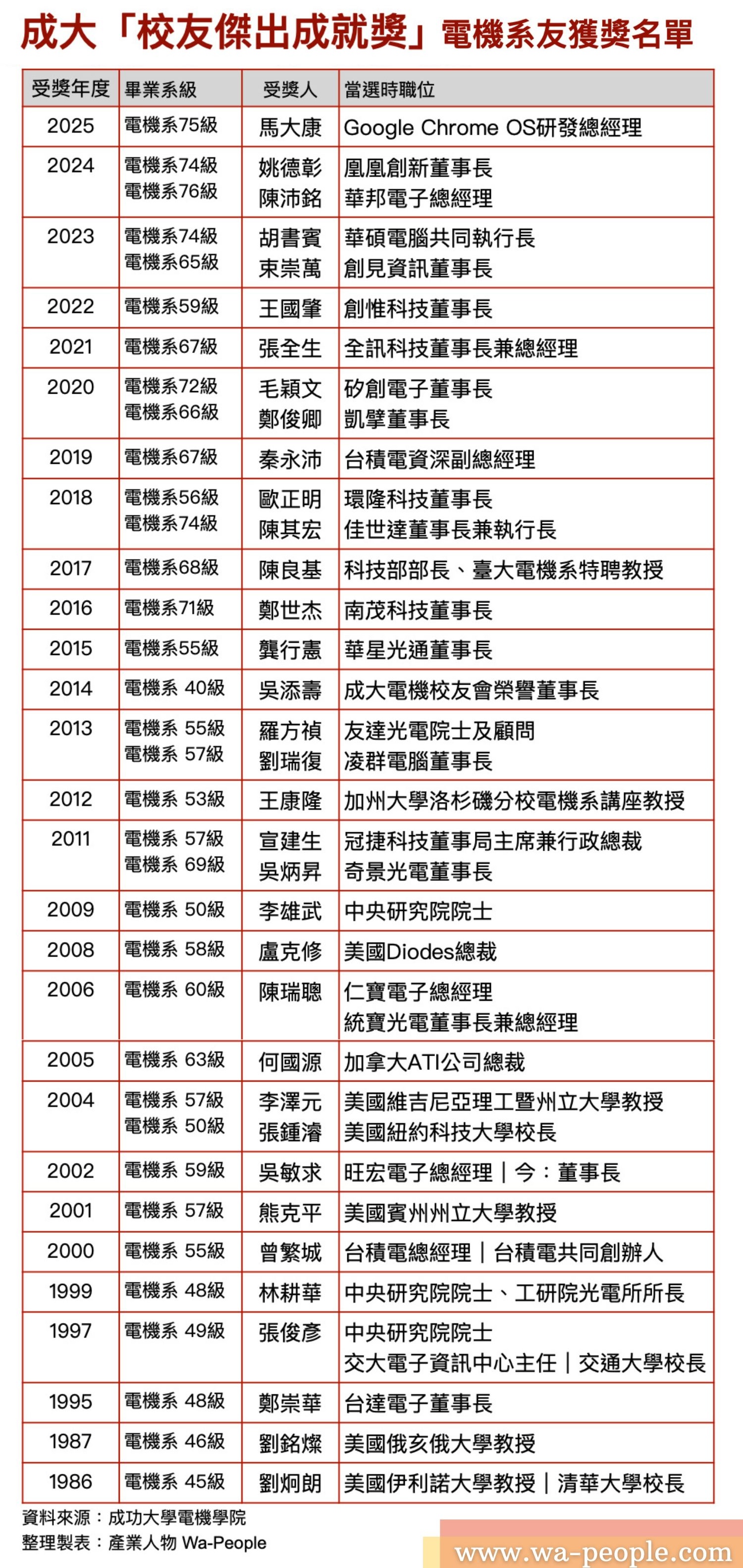 回顧歷年電機系友獲頒成大「校友傑出成就獎」的名單,有像吳敏求、王國肇這樣的創業企業家、台積電共同創辦人曾繁城、台積電資深副總秦永沛、上市公司董事長、總經理,還有張俊彥及劉炯朗,分別成了交通大學及清華大學的校長。