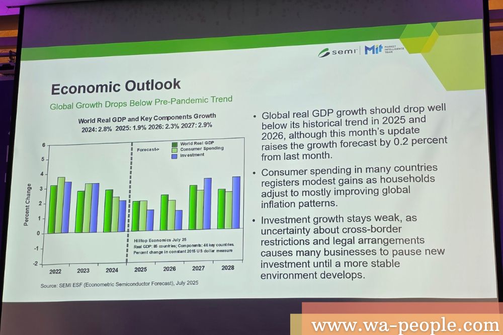 圖說:全球經濟展望,2025及2026年的GDP成長率、消費、投資,將低於疫情前的水準(資料來源:SEMI)