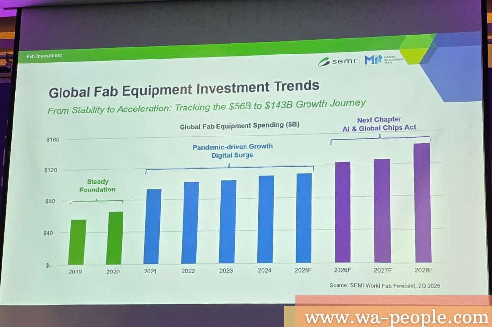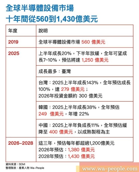 全球經濟存在不確定性的背景下,人工智慧(AI)產成為帶動半導體市場成長的關鍵動力。根據SEMI統計,2025上半年全球半導體設備市場年增20%,超過SEMI原先的預期,環顧全球各個區域市場,臺灣上半年投資設備年增143%,居世界之冠。