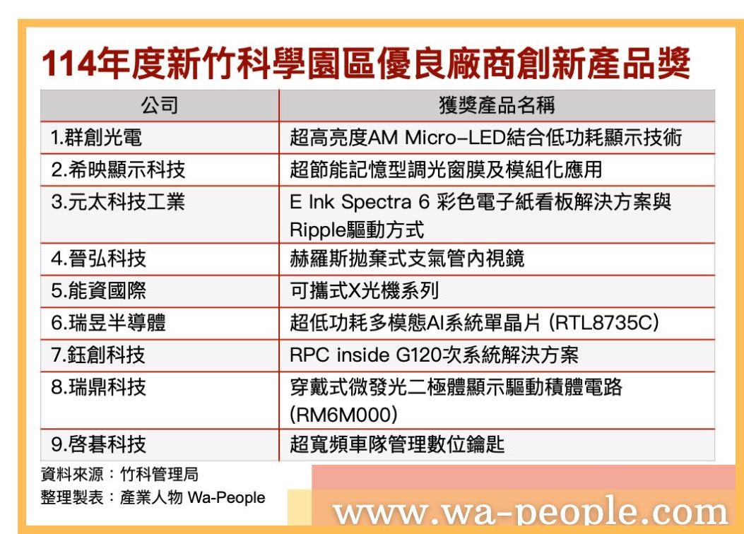 竹科45周年園慶特別安排新創展覽活動,由2025年參與新加坡科技創新週(SWITCH)的8家竹科潛力新創團隊展示,交流活動十分熱絡;現場也頒發本年度「優良廠商創新產品獎」、「 研發成效獎」、「 事業廢棄物減量及循環經濟成效績優企業獎」得獎名單如下: