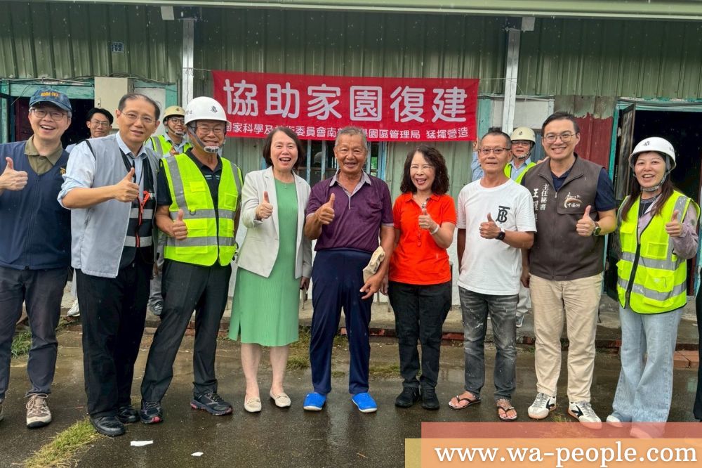 南科管理局局長鄭秀絨19日親自前往中埔鄉進行實地視察,除了解派駐人員的執行狀況外,也特別向積極投入修繕工作的施工廠商致謝,肯定其在災後第一線不辭辛勞、協助災民復原家園的努力。鄭秀絨表示:「南科管理局與地方是一個團隊,感謝各位施工廠商願意挺身而出,協助災民修繕家園。大家的努力,不只是修復一棟房屋,而是幫助災民重建生活的希望。」
