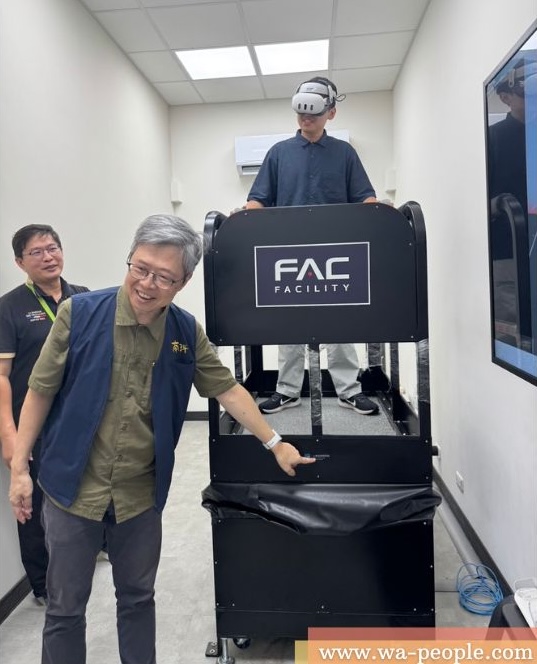 圖說:鄭秀絨局長視察嘉義園區XR教育訓練基地,台積電工安體感訓練模組,正在進行高空工作車墜落模擬訓練。