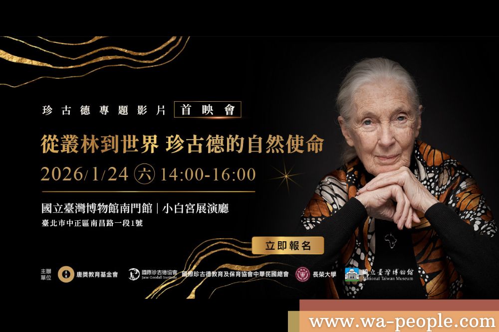 1月24日(六)唐獎教育基金會將偕同國際珍古德教育及保育協會中華民國總會、長榮大學及國立臺灣博物館等四個單位,於國立臺灣博物館南門館小白宮展演廳共同舉辦首映會,歡迎有興趣的民眾陪同孩子免費報名觀賞,座位有限,額滿為止,一同回顧博士非凡的一生。